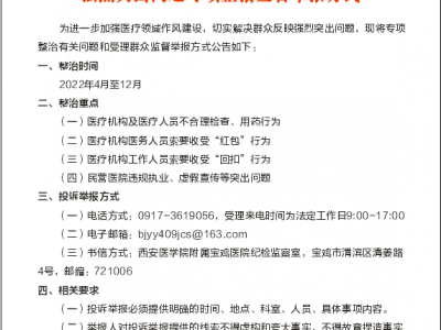 西安医学院附属宝鸡医院加强医疗领域作风建设 切实解决群众反映强烈突出问题专项整治监督举报方式